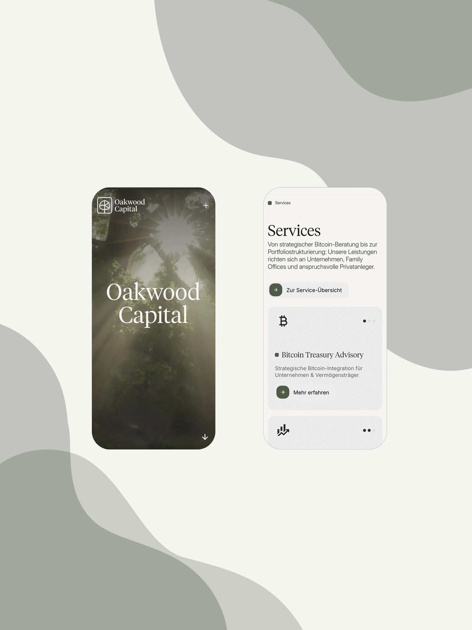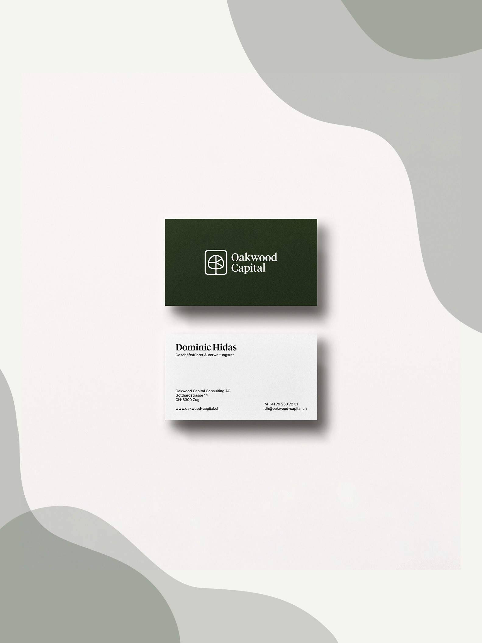 The branding was designed to be effective both digitally, especially on the website, and analogously in classic applications. The result is a clear, timeless brand presence that positions Oakwood Capital confidently in visual and media terms.
