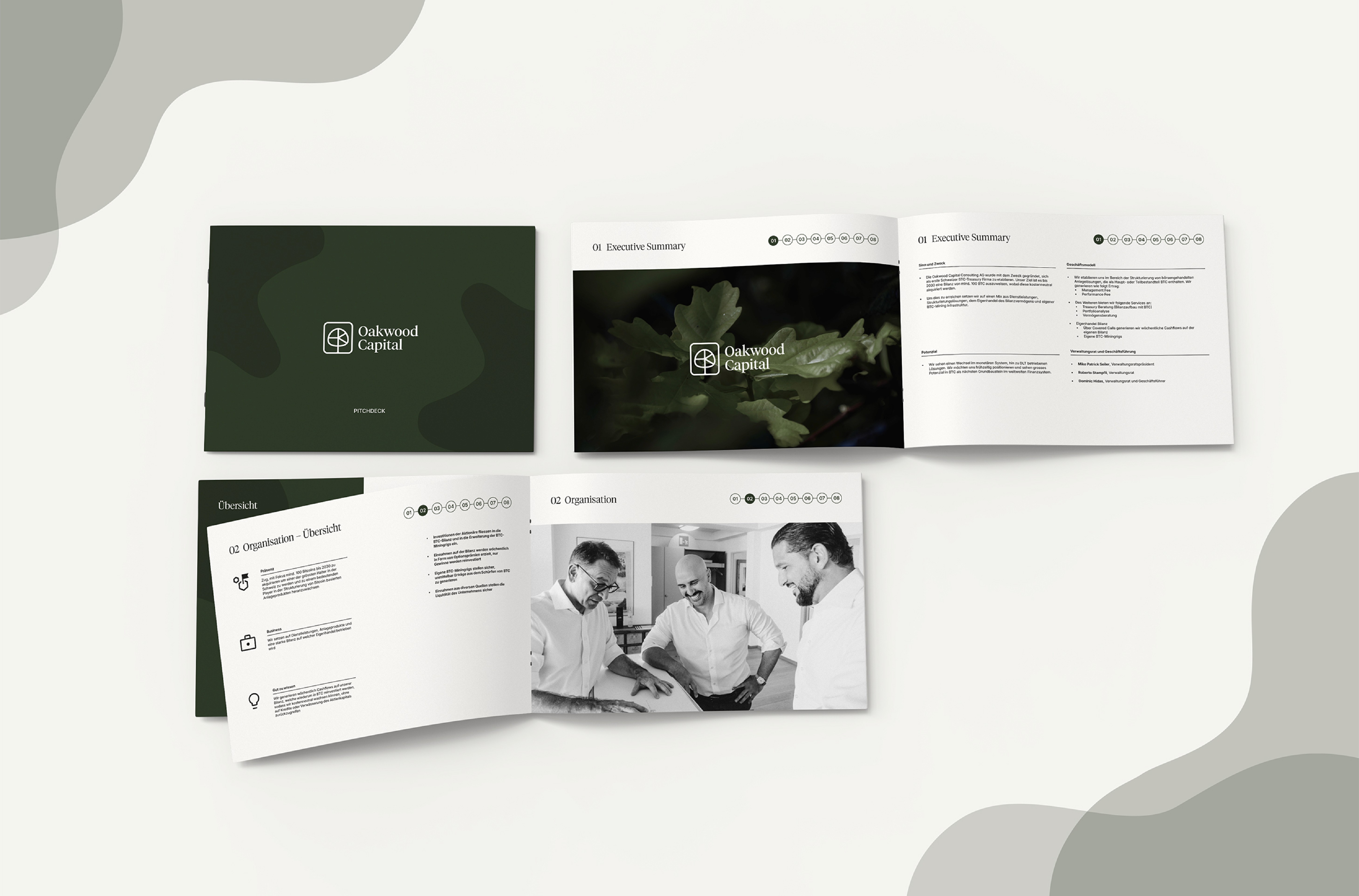 The imagery picks up on organic Oakwood leaves and combines them with a transparent, abstract pattern – modern, calm, and high-quality at the same time. The look is rounded off by a dark, elegant green that conveys trust, consistency, and exclusivity.